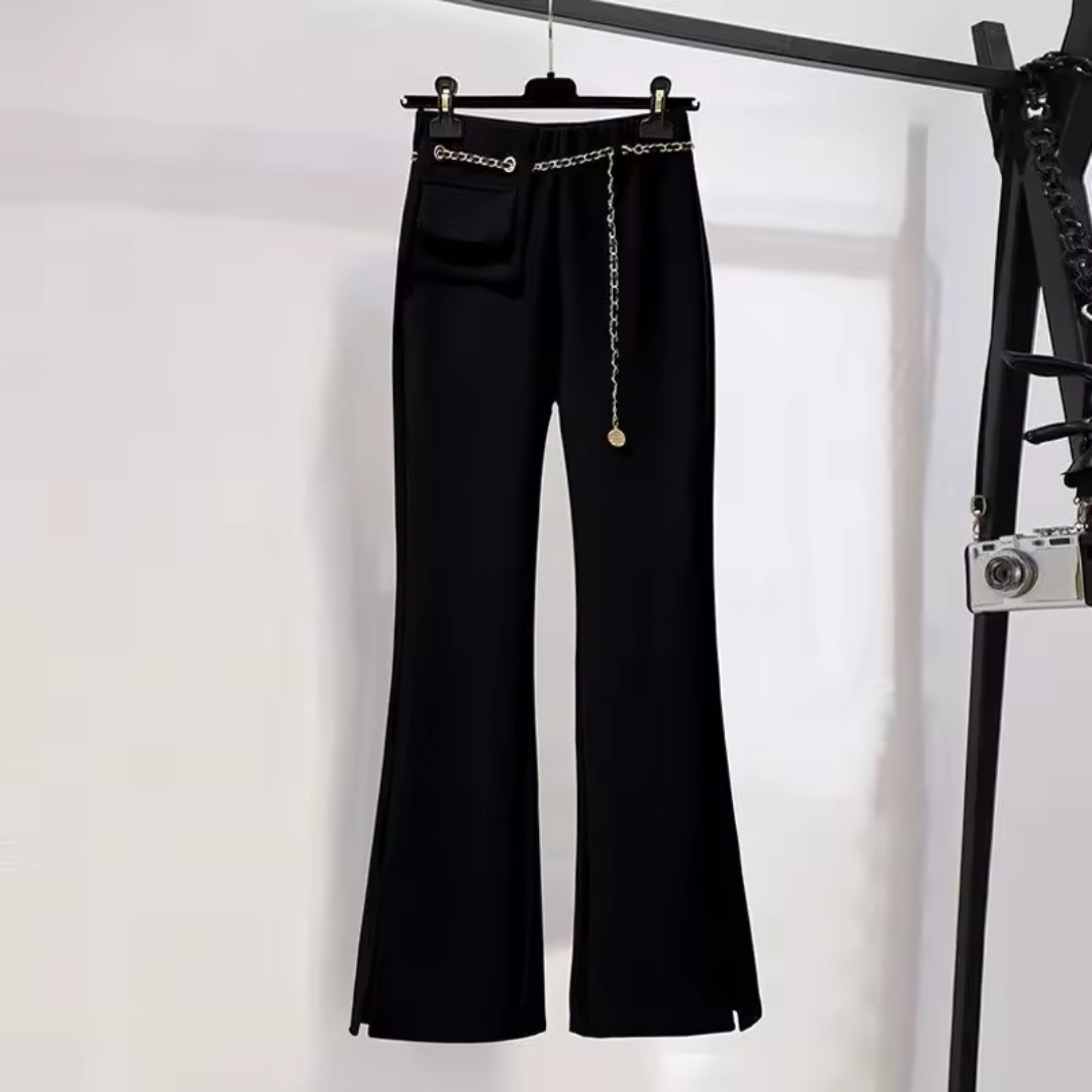 Pair the elegant blazer with its matching trousers for a seamless and refined outfit. The high-waisted, wide-leg cut elongates your figure, while the delicate chain detail adds a touch of modern luxury.